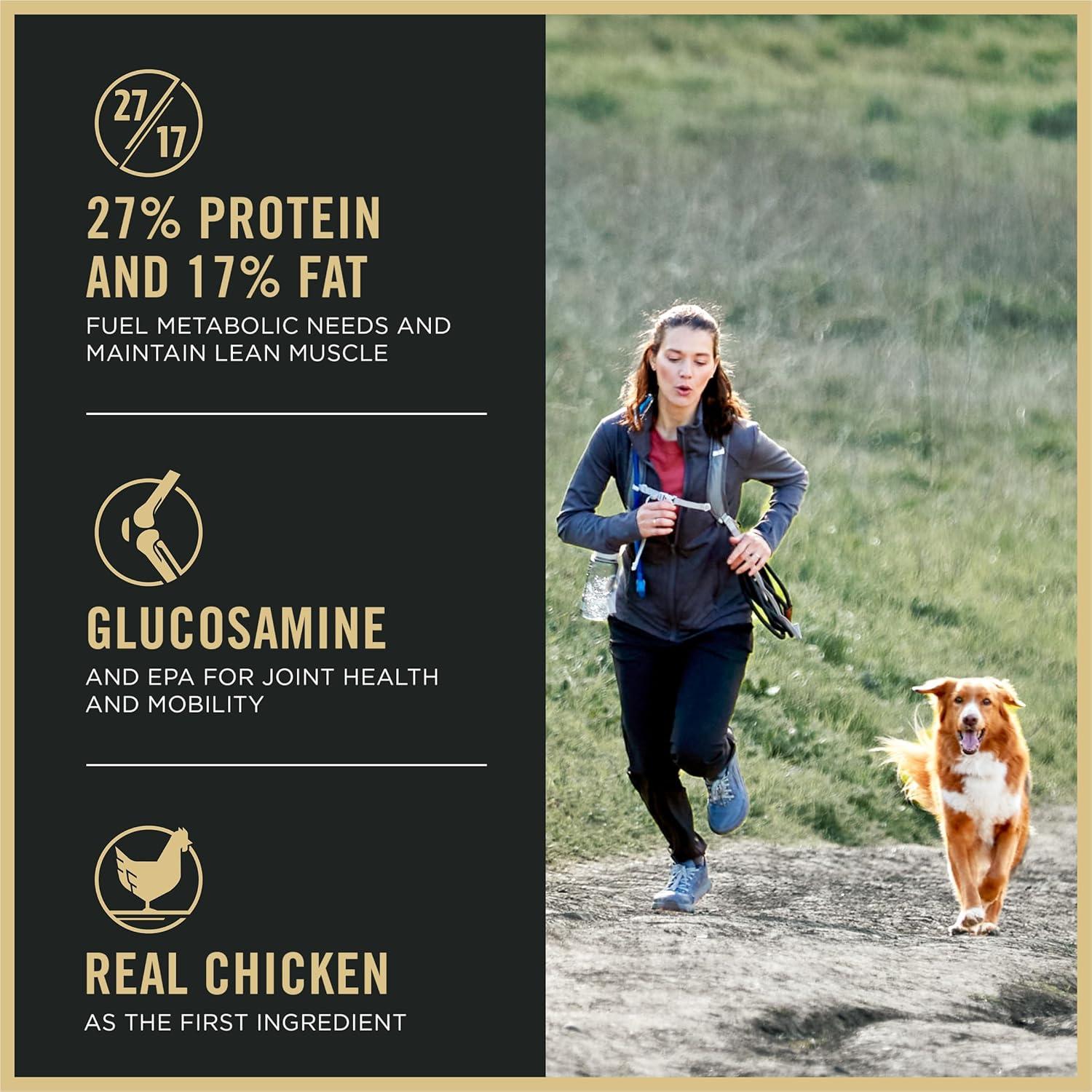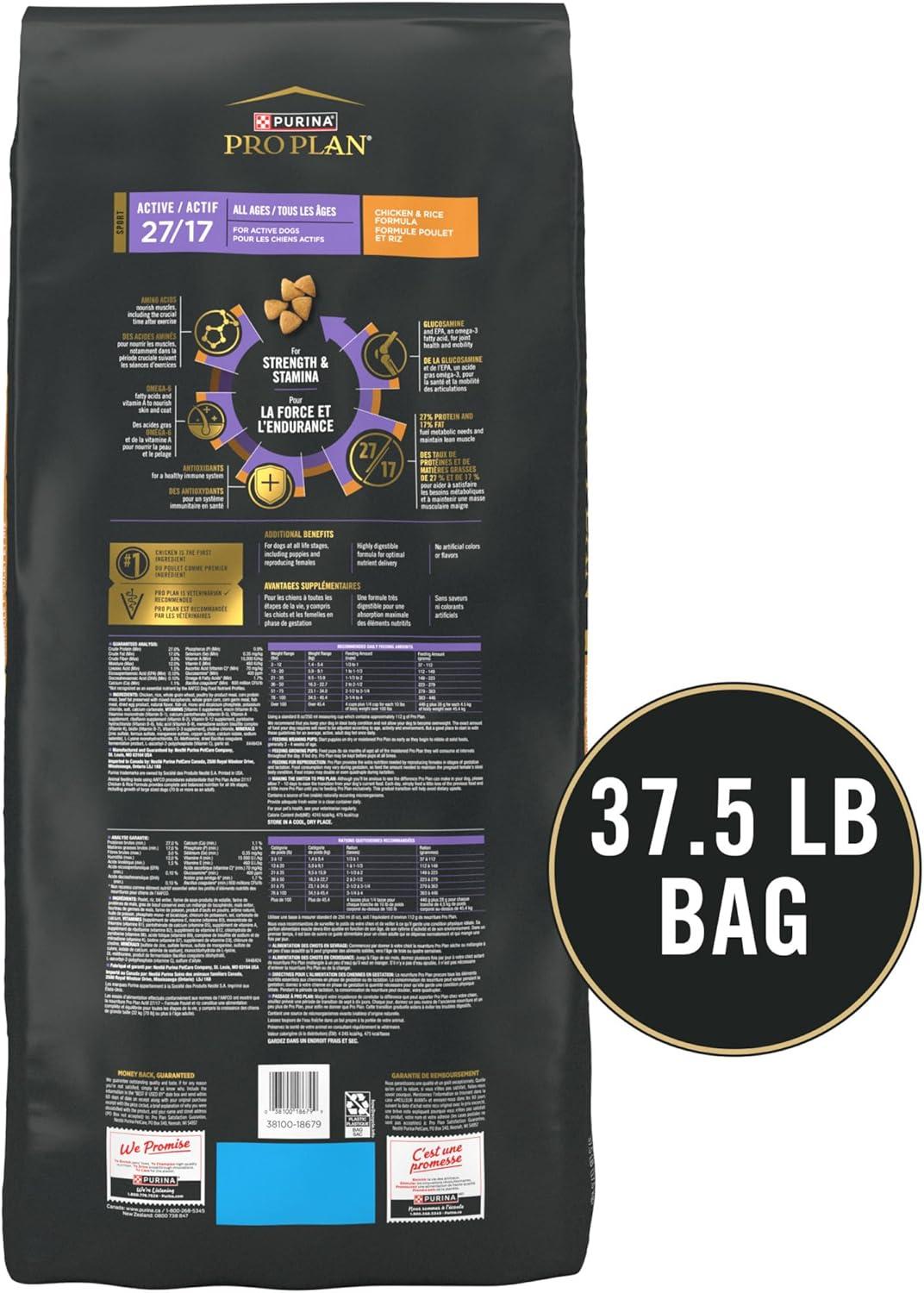 Give your dog the nutrition he needs to excel with Purina Pro Plan Brand Dog Food Active 27/17 Chicken and Rice Formula dry dog food. Including chicken as the first ingredient, this high protein dog food helps to promote total body health. The highly digestible dog food formula helps promote optimal nutrient delivery to support active dogs, whether they enjoy running by your side or taking long walks. With 27 percent protein and 17 percent fat to help maintain lean muscle and an ideal body condition, and rich in antioxidants to help support your dog's healthy immune system, this Purina Pro Plan dog food helps you care for his overall health every time you fill his dish. Each serving of Purina Pro Plan Active 27/17 offers 100 percent complete and balanced nutrition throughout every stage of his life, so he can enjoy the food he loves from his playful puppy days all the way up to his senior years.