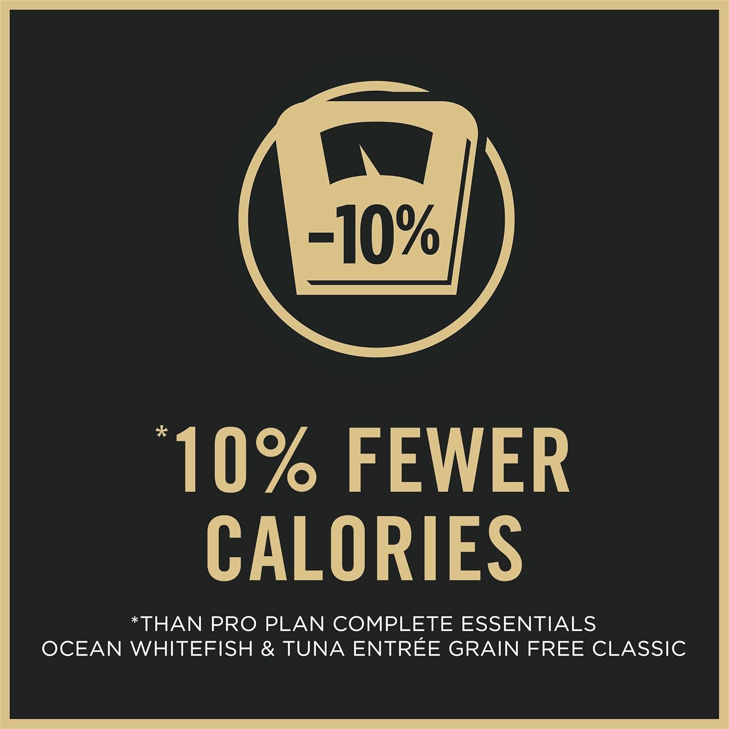 This food has 10 percent fewer calories than Pro Plan Complete Essentials Ocean Whitefish and Tuna Entree Grain Free Classic.