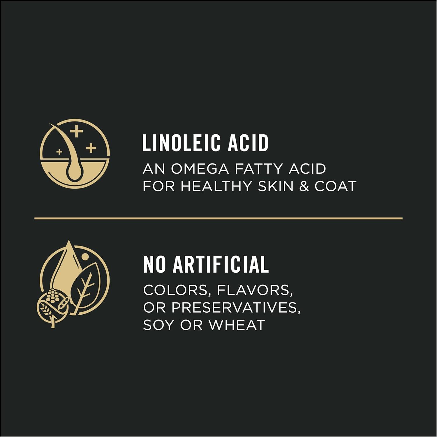 Sensitive skin dog food includes linoleic acid, an omega fatty acid, for healthy skin and coat and contains no artificial colors, flavors or preservatives