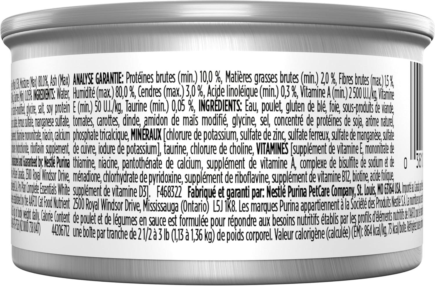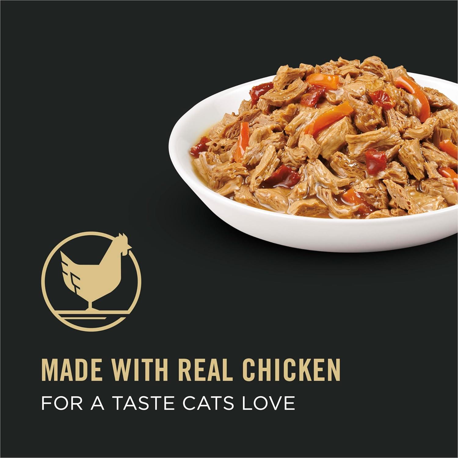 Watch your cat lick her dish clean with Purina Pro Plan COMPLETE ESSENTIALS Chicken and Rice Entree in Gravy adult wet cat food. This high protein canned cat food uses real chicken complemented with rice for rich taste. Savory gravy adds delicious flavor and moisture to every mouthwatering morsel of this premium cat wet food made with no artificial colors or preservatives. Our chicken and gravy cat food contains antioxidants for a healthy immune system, and omega-6 fatty acids and vitamin A nourish her skin and coat. The soft cat food contains vitamin A and taurine to support healthy vision. Our high fiber cat food provides 100 percent complete and balanced nutrition for adult cats with an optimal protein level for maintaining an ideal body condition. Delight her with delicious taste and tender texture, and watch as the enticing aroma tempts her to her dish. She enjoys a sensory experience that enriches her dining experience, and you feel good giving her nutrition that performs.