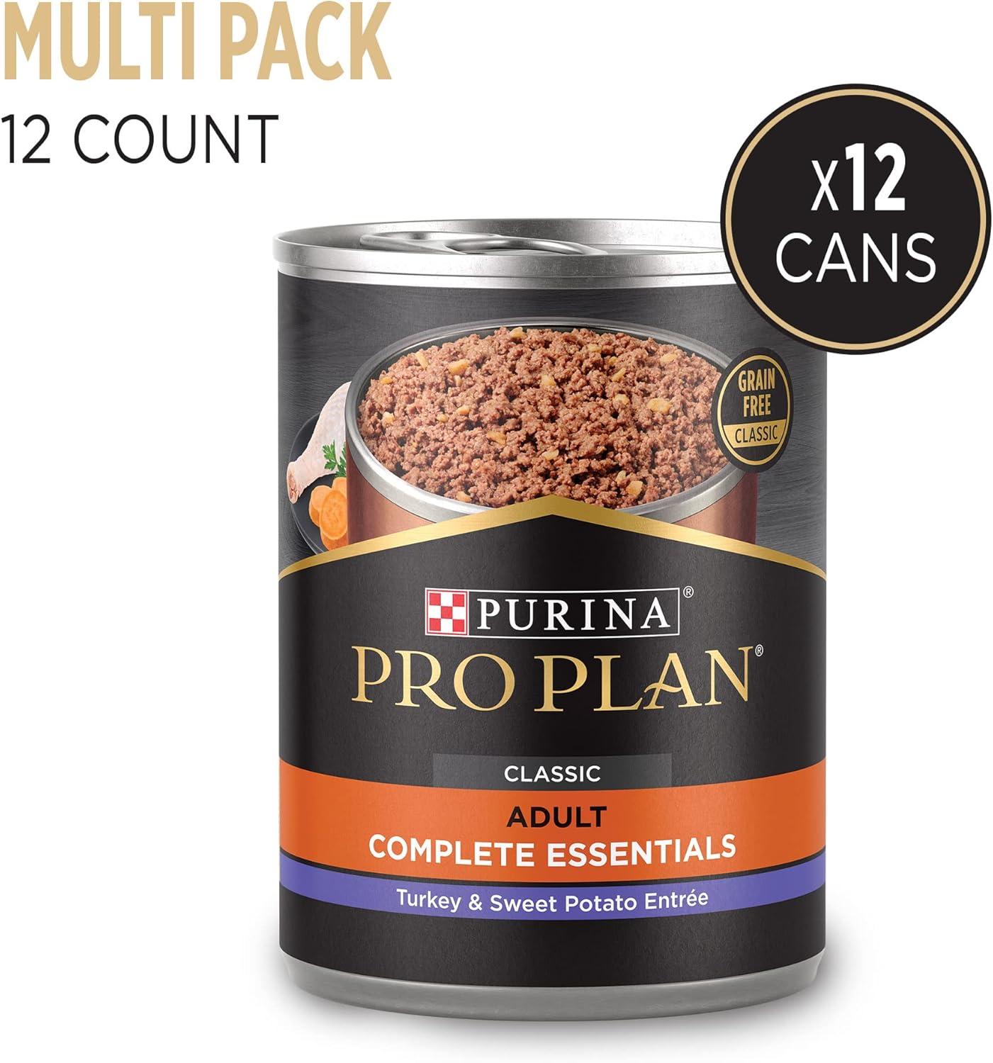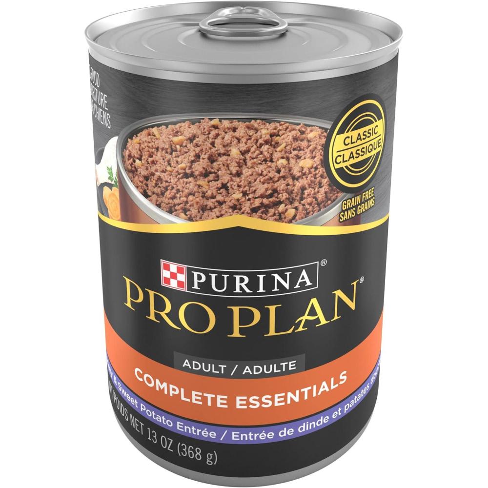 Nourish your dog with the high-quality, purposeful ingredients in Purina Pro Plan COMPLETE ESSENTIALS Grain Free Classic Turkey and Sweet Potato Entree adult wet dog food. With real turkey as the number 1 ingredient, this premium dog wet food offers the flavor dogs love with no artificial colors, flavors or preservatives. This high protein wet dog food helps build lean muscles while helping maintain an ideal body condition. Each serving of this natural dog food provides 23 essential vitamins and nutrients to support overall health and wellness and helps support a healthy immune system and nourish his skin and coat. The tender texture and tempting flavor of this grain free wet dog food pate get him excited to dine. Add Purina Pro Plan COMPLETE ESSENTIALS turkey and sweet potato dog food pate to his bowl, and give your adult dog 100 percent complete and balanced nutrition without compromise. We proudly manufacture this grain free high protein dog food at Purina-owned, U.S. facilities.