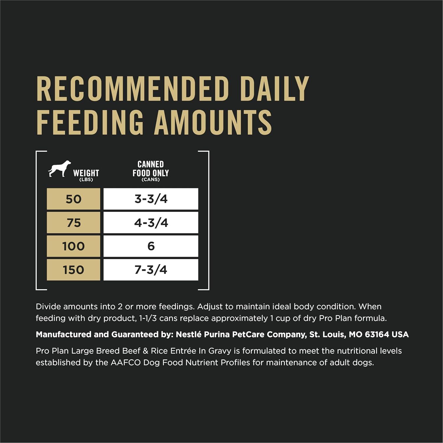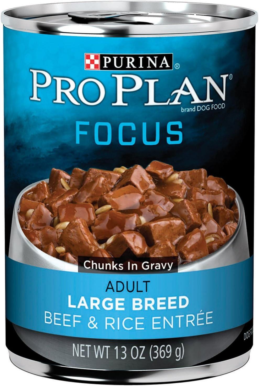 Support your large dog with Purina Pro Plan SPECIALIZED Large Breed Beef and Rice Entree Chunks in Gravy adult wet dog food. This gravy dog food formula uses high-quality protein, including real beef, with highly digestible rice and no artificial colors, flavors or preservatives. Each ingredient in our canned dog food is chosen for a specific purpose, so your large breed dog gets what he needs. This Purina Pro Plan dog food is 100 percent complete and balanced for adult dogs over 50 pounds and includes 23 essential vitamins and minerals to support overall health. The high protein dog food helps promote lean muscle. Calcium and phosphorus in our large breed adult dog food help maintain strong bones and teeth. Your large dog gets specialized nutrition in this canned beef dog food to help support a healthy immune system. Omega-6 fatty acids in this dog wet food help support his skin and coat. Meet his needs with Purina Pro Plan SPECIALIZED wet dog food with nutrition that performs.