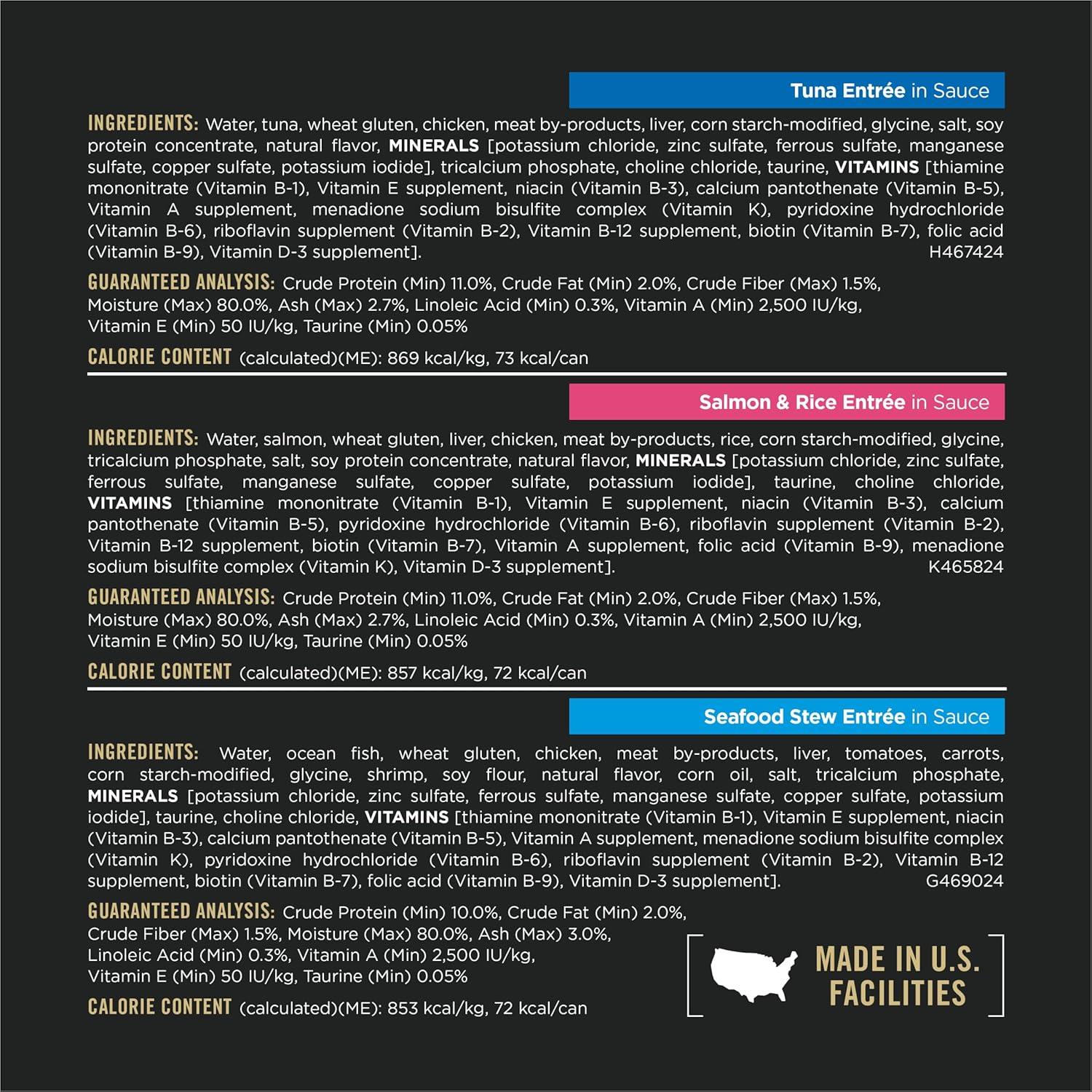 Purina Pro Plan Complete Essentials Seafood Favorites adult wet cat food variety pack is made with real seafood for a taste cats love and no artificial colors or preservatives.