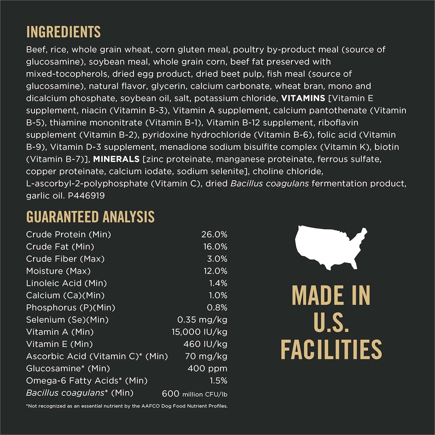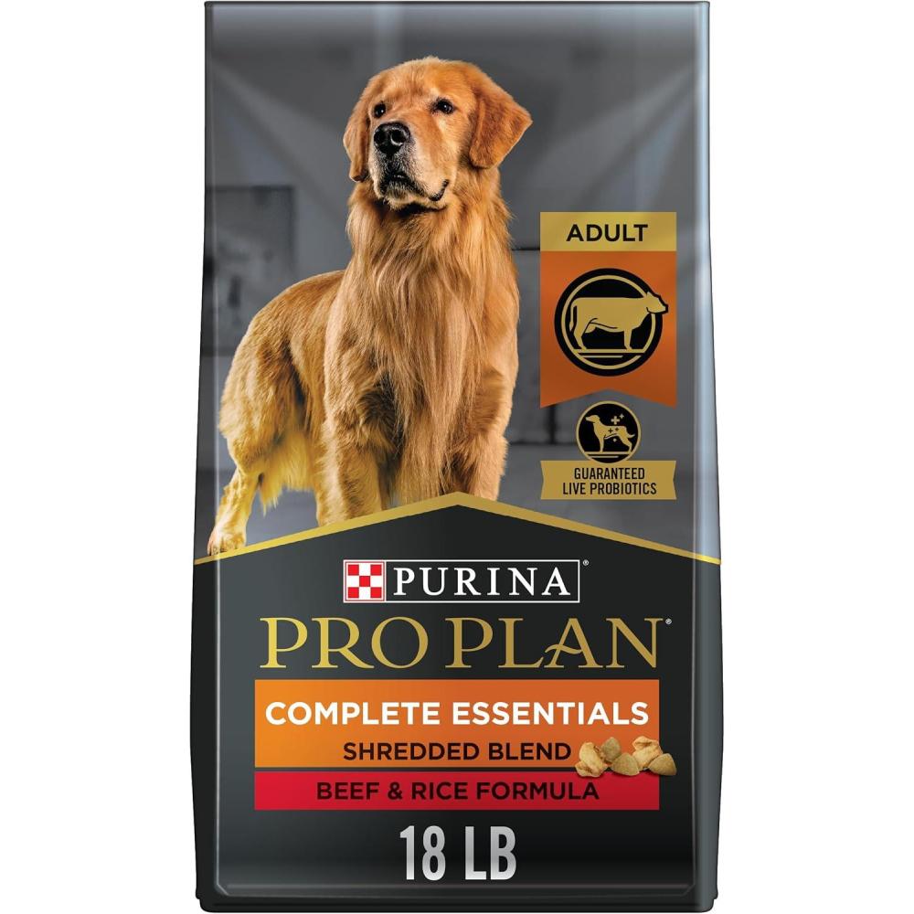 Serve him Purina Pro Plan Brand Dog Food Shredded Blend Chicken and Rice Formula adult dry dog food to make meals exciting. Real chicken as the first ingredient and rice, an excellent source of carbohydrates for energy, along with other high-quality ingredients create a wholesome meal with great flavor. The hard dog food kibble and tender shredded pieces in this Pro Plan dog food provide a texture that engages him with every bite. Feel good about serving your dog 100 percent complete and balanced nutrition that contains a high level of protein to help dogs maintain an ideal body condition. Vitamin A and linoleic acid, an omega-6 fatty acid, promote healthy skin and coat, and guaranteed live probiotics help to support his digestive health. Formulated with high-quality protein and other essential nutrients and manufactured in Purina-owned U.S. facilities, this Purina Pro Plan COMPLETE ESSENTIALS formula helps support your beloved pet's overall health and wellness.