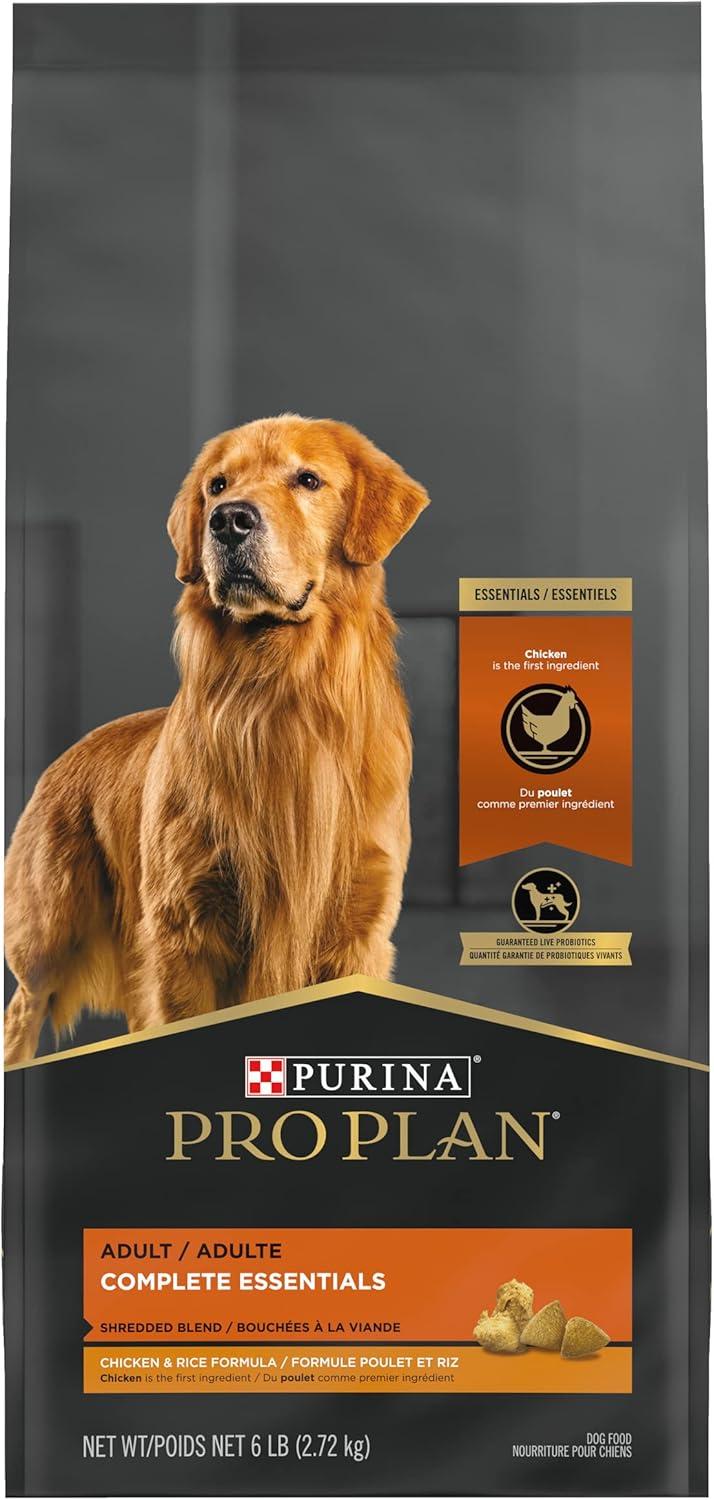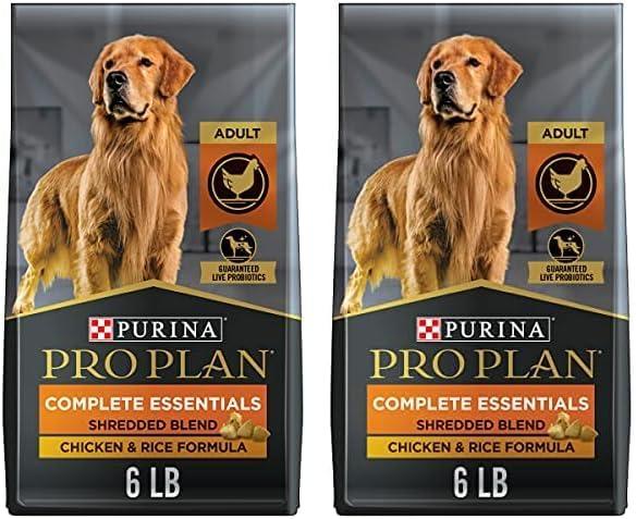 Serve him Purina Pro Plan Brand Dog Food Shredded Blend Chicken and Rice Formula adult dry dog food to make meals exciting. Real chicken as the first ingredient and rice, an excellent source of carbohydrates for energy, along with other high-quality ingredients create a wholesome meal with great flavor. The hard dog food kibble and tender shredded pieces in this Pro Plan dog food provide a texture that engages him with every bite. Feel good about serving your dog 100 percent complete and balanced nutrition that contains a high level of protein to help dogs maintain an ideal body condition. Vitamin A and linoleic acid, an omega-6 fatty acid, promote healthy skin and coat, and guaranteed live probiotics help to support his digestive health. Formulated with high-quality protein and other essential nutrients and manufactured in Purina-owned U.S. facilities, this Purina Pro Plan COMPLETE ESSENTIALS formula helps support your beloved pet's overall health and wellness.