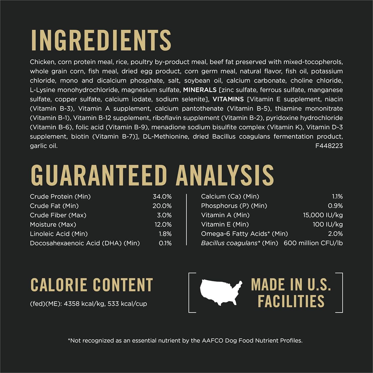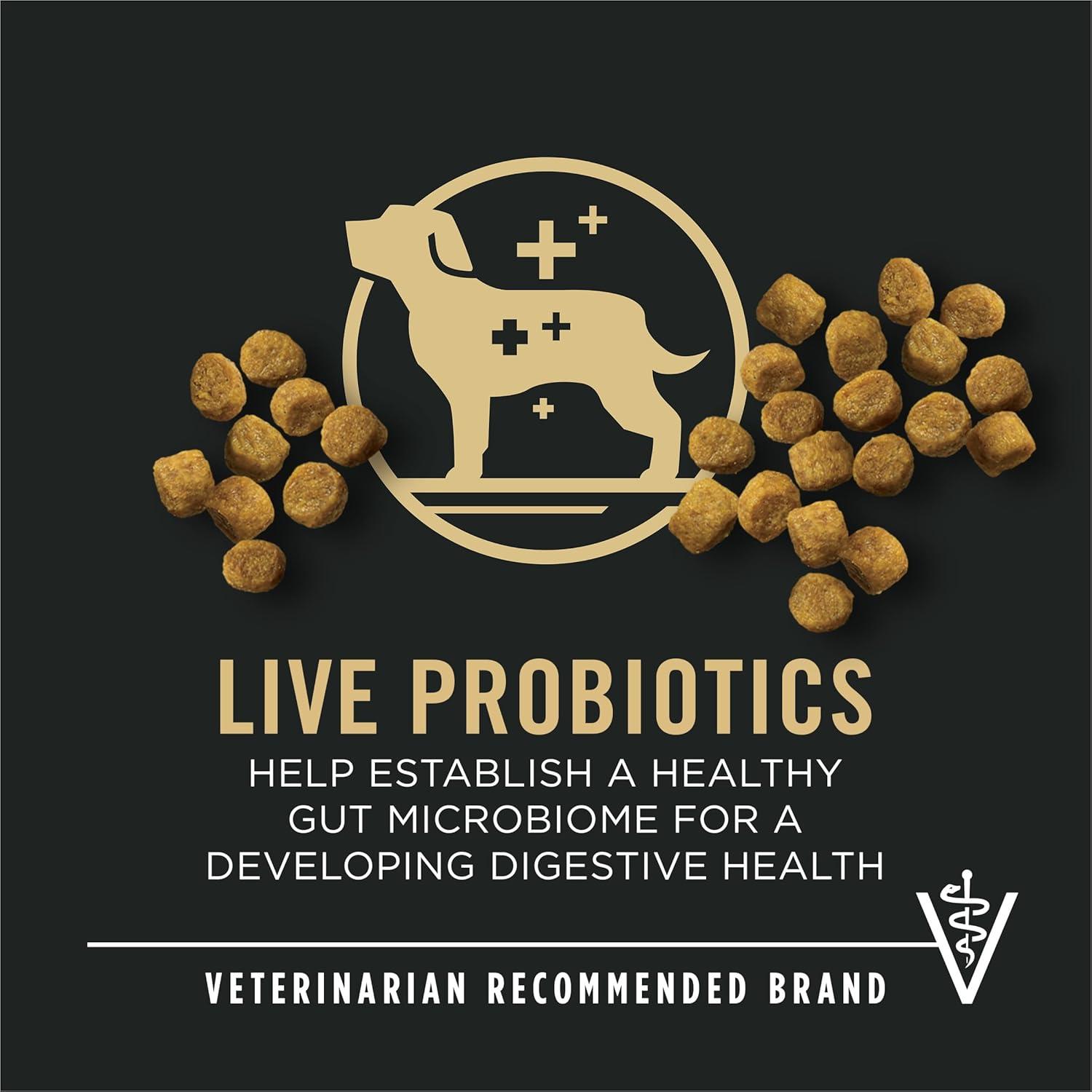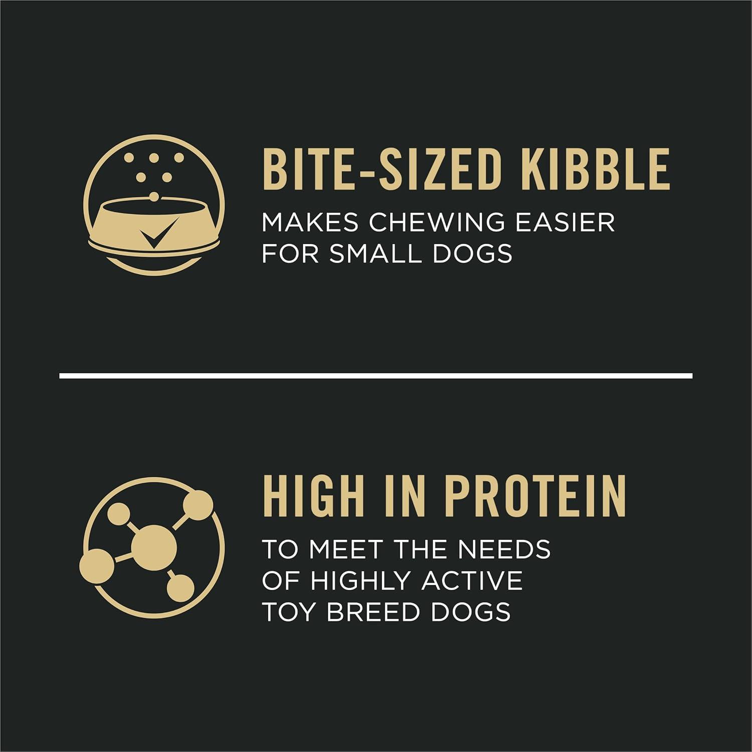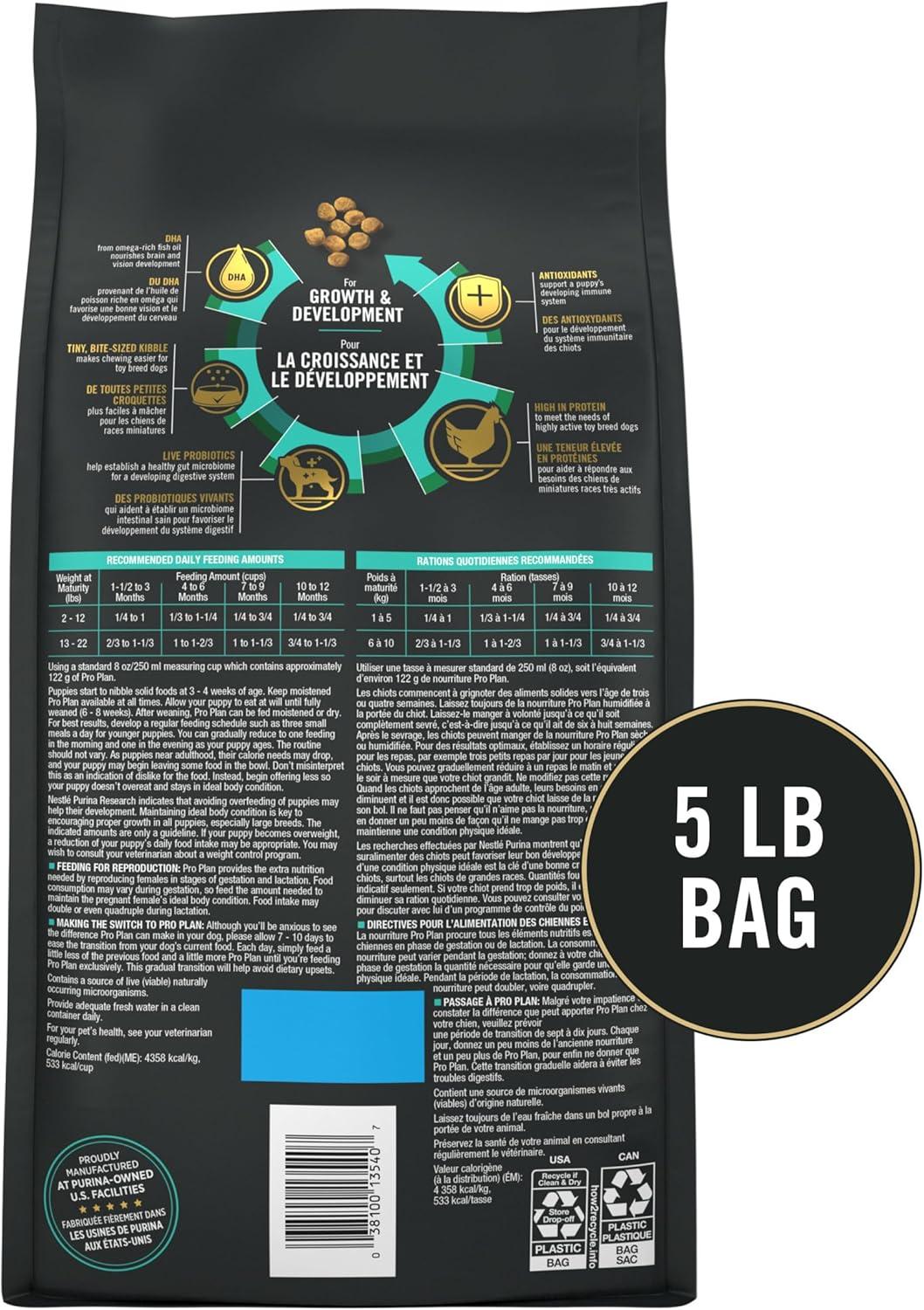 Care for your growing toy breed puppy's unique nutritional needs by serving him Purina Pro Plan Brand Dog Food Puppy Toy Breed Chicken and Rice Formula dry puppy food. Formulated for puppies weighing under 10 pounds at maturity, this small breed dry puppy food helps support his overall health and wellness through this important early life stage. High-quality protein, including real chicken as the number 1 ingredient, provides some of the essential nutritional building blocks within his little body. We fortify this small puppy kibble with guaranteed live probiotics for dogs to support his digestive and immune health. This super-premium small puppy food nourishes his brain and vision development with DHA from fish oil, while calcium, phosphorus and other minerals build strong bones and teeth. Our highly digestible dry food for puppies promotes nutrient bioavailability to deliver optimal nutrient absorption so your puppy gets the most out of every bowlful of bite-sized pieces of crunchy kibble.
