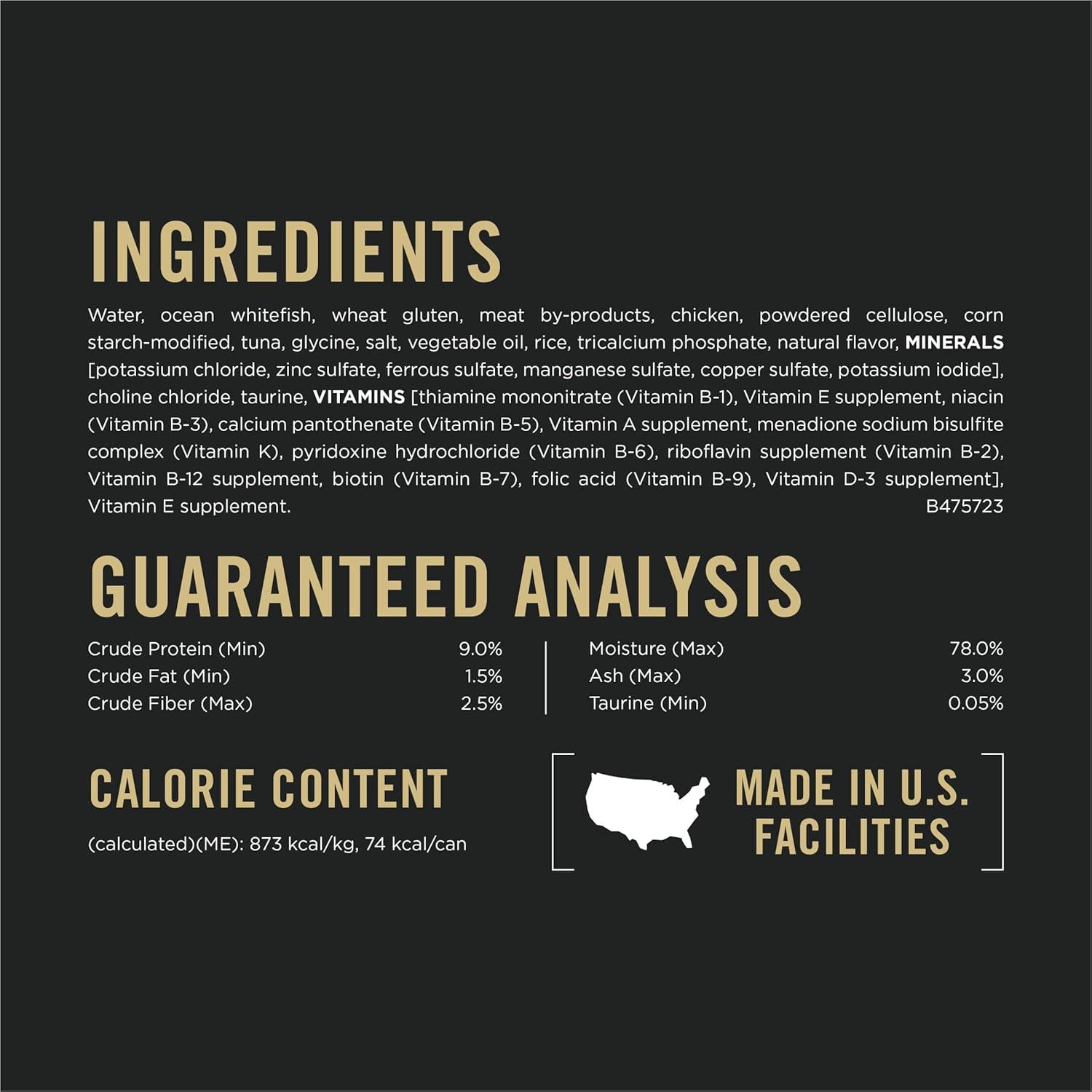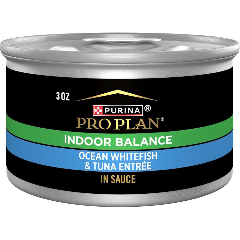 Keep your cat's weight under control and minimize hairballs with Purina Pro Plan SPECIALIZED Indoor Grilled Ocean Whitefish and Tuna Entree in Sauce adult wet cat food. We tailor this high protein wet cat food formula to meet her unique needs. Real ocean whitefish in the cat wet food recipe creates a taste cats adore. Natural fiber in the premium cat food formula promotes hairball control, and 25 essential vitamins and minerals support your cat's overall health. We carefully choose every high-quality ingredient in this weight control cat food to serve a specific purpose and include no artificial colors or preservatives in this Purina cat food to satisfy your need for quality ingredients. Give your adult cat the 100 percent complete and balanced focused nutrition she needs to live her best indoor life with our Indoor Grilled Ocean Whitefish and Tuna Entree in sauce. We proudly manufacture this high fiber cat food at Purina-owned facilities.