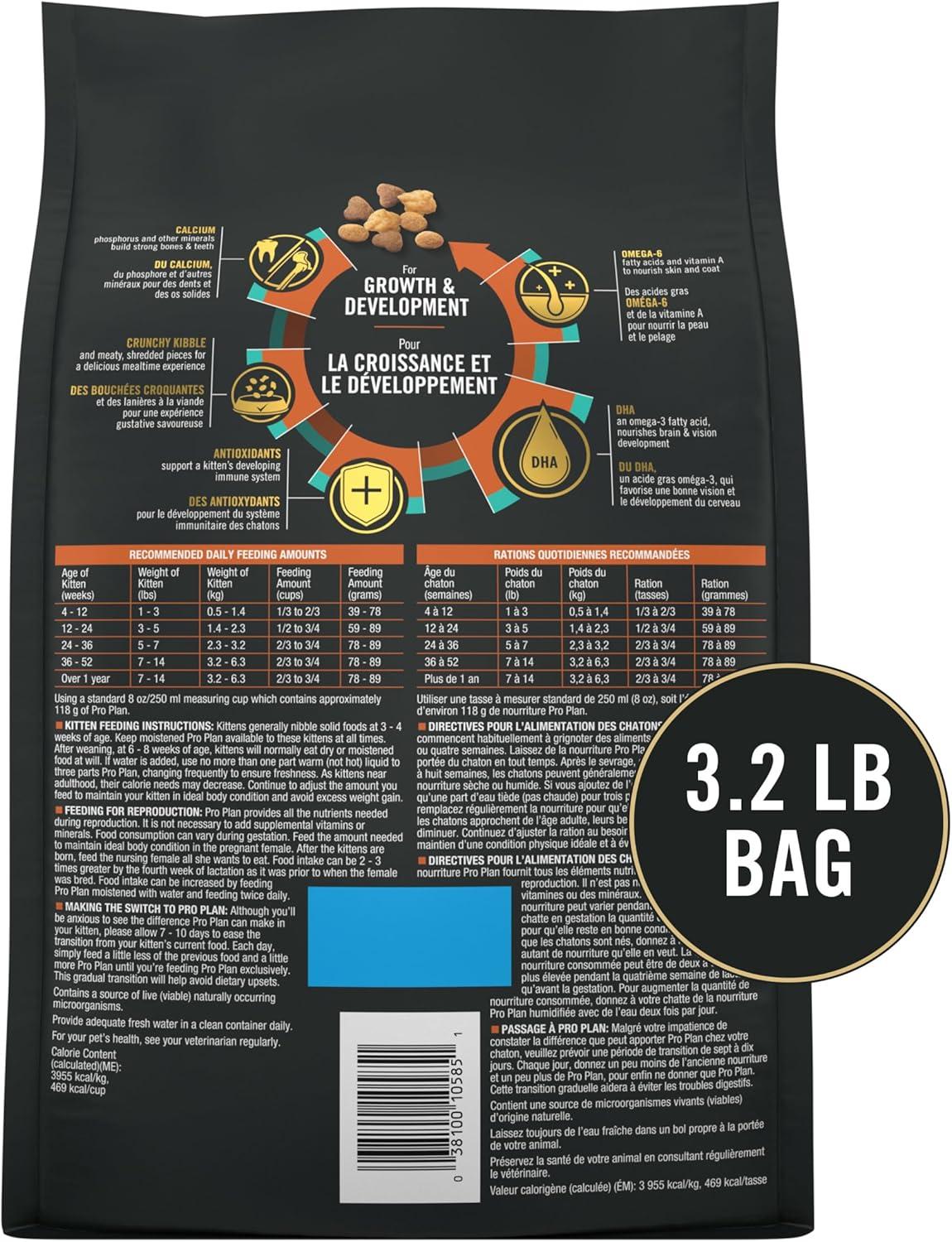 Your kitten's first year development is very important, which is why veterinarians recommend Purina Pro Plan Kitten Dry Food Complete Essentials Shredded Blend Chicken and Rice Formula. This cat kibble offers perfectly sized bites that are meaty and crunchy, providing an irresistible texture that kittens love. Every serving in this Purina Pro Plan kitten formula delivers DHA, an omega-3 fatty acid to nourish her brain and vision development and omega-6 fatty acids and vitamin A to nourish skin and coat. Every bowl of this dry kitten formula is fortified with guaranteed live probiotics to support digestive and immune health. This premium, delicious formula contains high quality ingredients for optimal nutrient delivery. Purina Pro Plan Kitten Dry Food Complete Essentials Shredded Blend Chicken and Rice Formula is a great option for your kitten.
