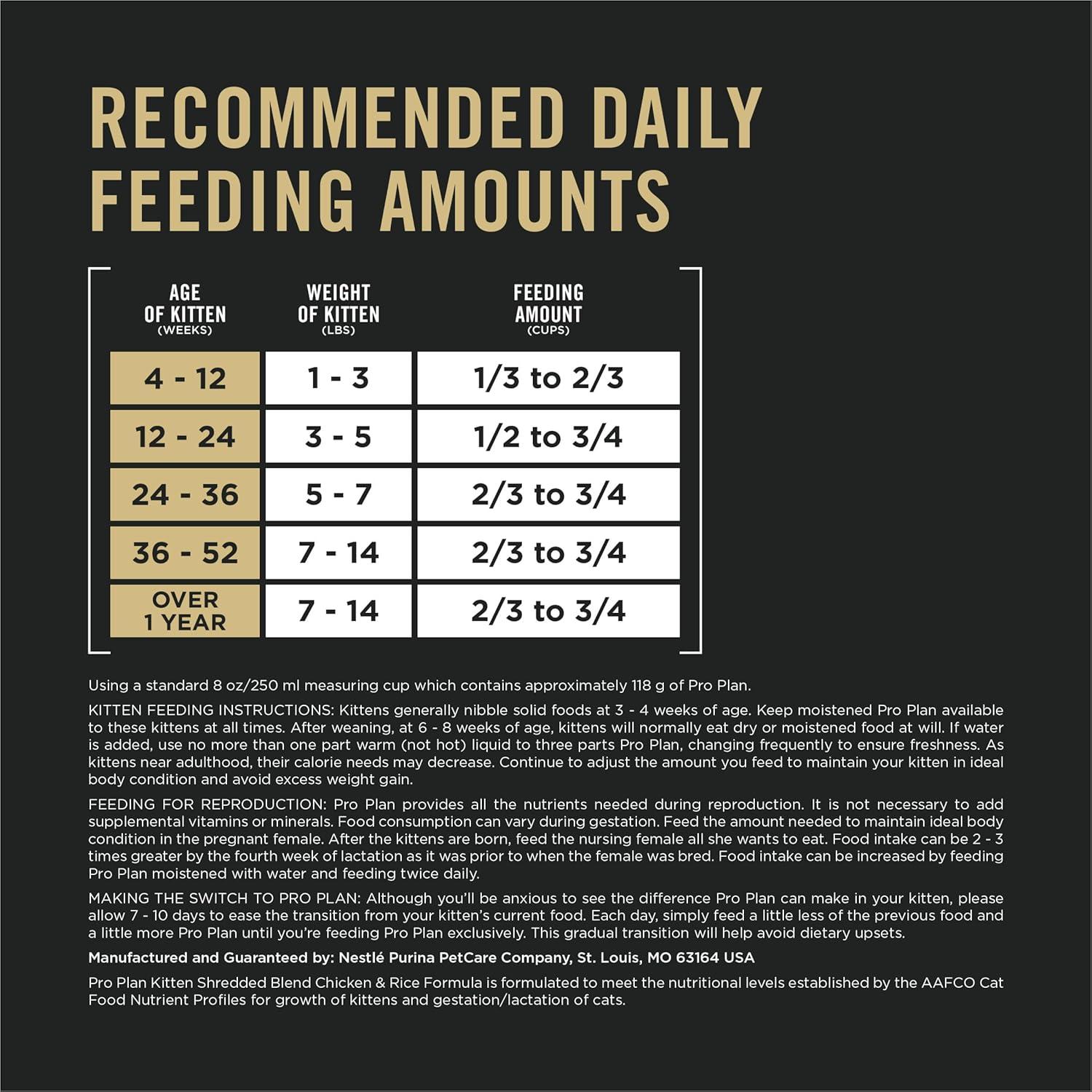 Your kitten's first year development is very important, which is why veterinarians recommend Purina Pro Plan Kitten Dry Food Complete Essentials Shredded Blend Chicken and Rice Formula. This cat kibble offers perfectly sized bites that are meaty and crunchy, providing an irresistible texture that kittens love. Every serving in this Purina Pro Plan kitten formula delivers DHA, an omega-3 fatty acid to nourish her brain and vision development and omega-6 fatty acids and vitamin A to nourish skin and coat. Every bowl of this dry kitten formula is fortified with guaranteed live probiotics to support digestive and immune health. This premium, delicious formula contains high quality ingredients for optimal nutrient delivery. Purina Pro Plan Kitten Dry Food Complete Essentials Shredded Blend Chicken and Rice Formula is a great option for your kitten.