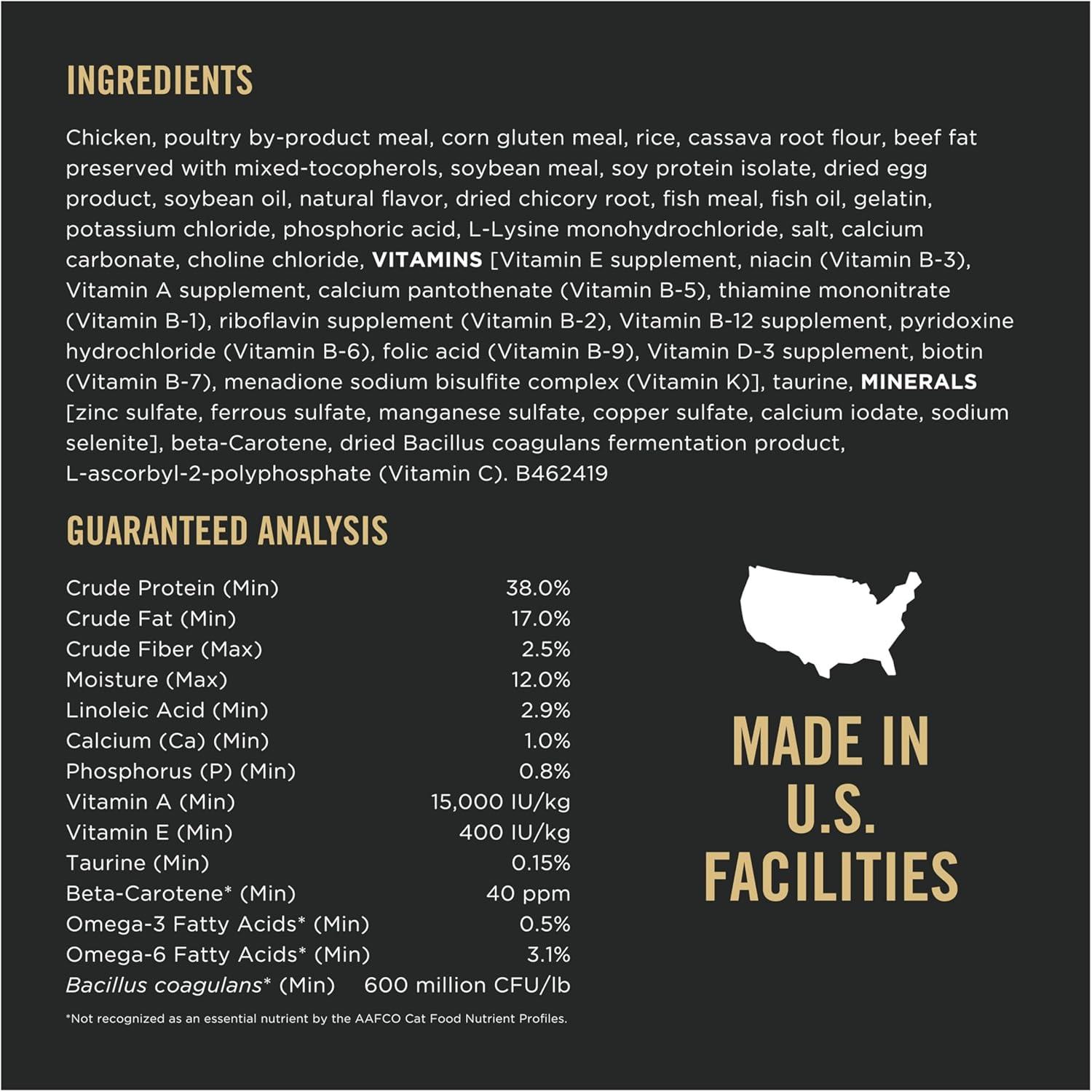 Keep your senior cat happy with Purina Pro Plan Brand Cat Food SENIOR Adult 7+ Chicken and Rice Formula dry cat food. This senior cat food contains a unique blend that has been proven in a nine-year study to improve and extend the lives of cats age 7+. Findings are based on cats exclusively fed a complete diet with the proprietary blend vs. cats fed the complete and balanced diet alone. This high-protein cat food also promotes lean muscle mass and helps maintain a healthy weight. Real chicken is the first ingredient in our Chicken and Rice cat food formula which provides balanced nutrition that helps your senior cat thrive. Plus, it includes the antioxidants beta carotene and vitamin E, omega-3 fatty acids from fish oil, and omega-6 fatty acids from soybean oil. The key nutrients in this Purina dry cat food help support your cat's immune system and improve the microflora in her stomach to help maintain a balanced digestive system and support your favorite feline's healthy skin.