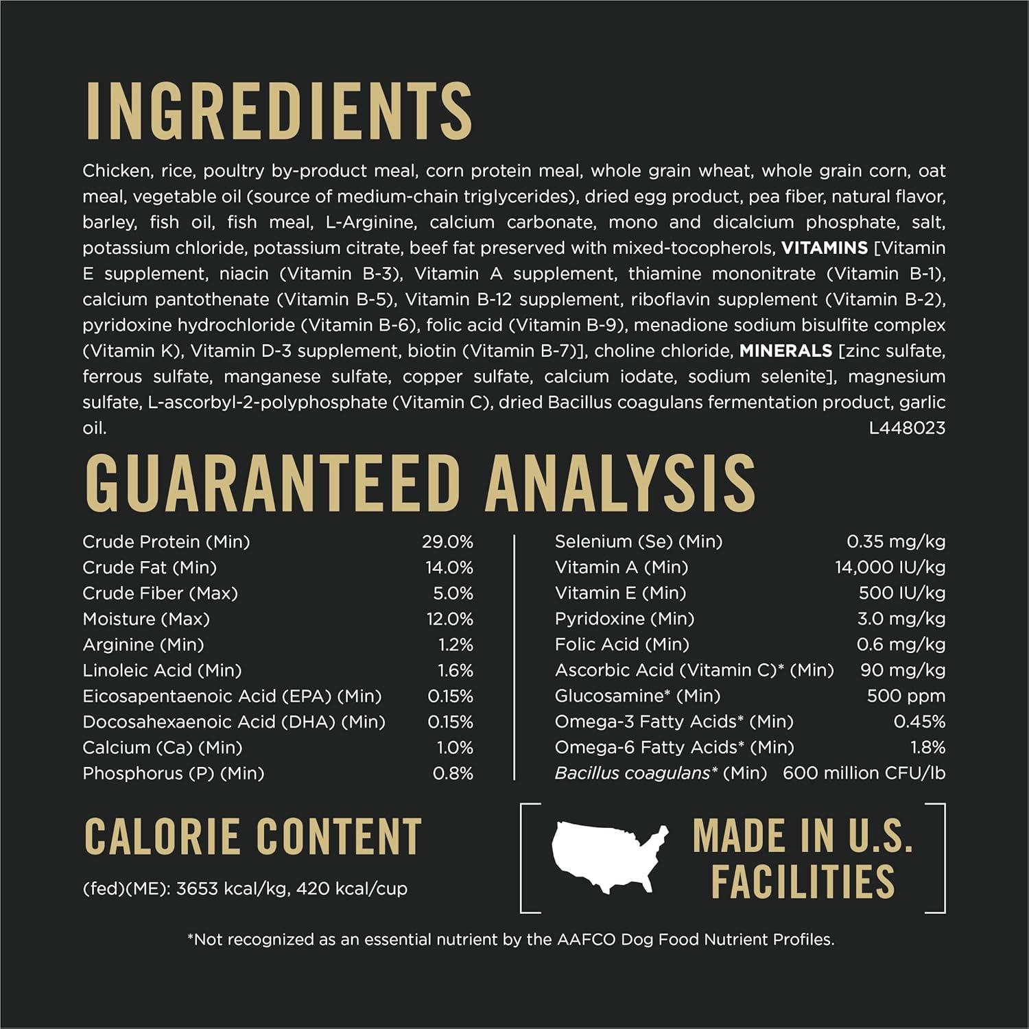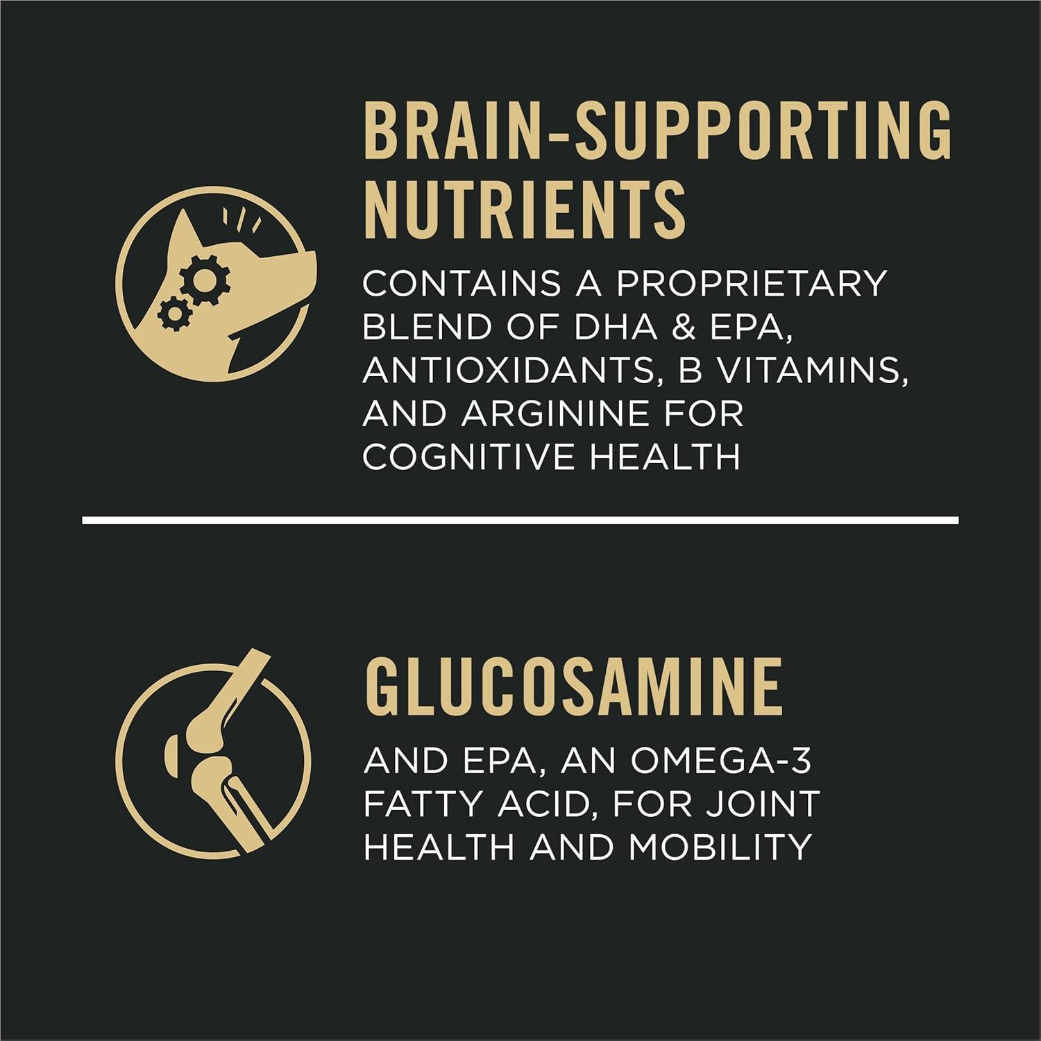 Support your dog's mental health with Purina Pro Plan BRIGHT MIND Adult 7+ Chicken and Rice Formula dry dog food. Around age 7, a dog's brain begins to change how it metabolizes glucose, which can affect memory, learning, awareness or decision-making. Purina discovered that enhanced botanical oils can be used to provide an additional fuel source for the brain in dogs age 7+. When added to the daily diet of dogs 7 and older, these enhanced botanical oils promoted memory, attention and trainability. With chicken as the first ingredient, this tasty Purina dog food provides your favorite canine companion with a high-quality source of protein. Glucosamine and EPA, an omega-3 fatty acid, support your dog's joint health and mobility, while omega-6 fatty acids and vitamin A promote healthy skin and a beautiful coat. Feel good about feeding your dog a formula designed to deliver the nutrition he needs and the taste he loves.