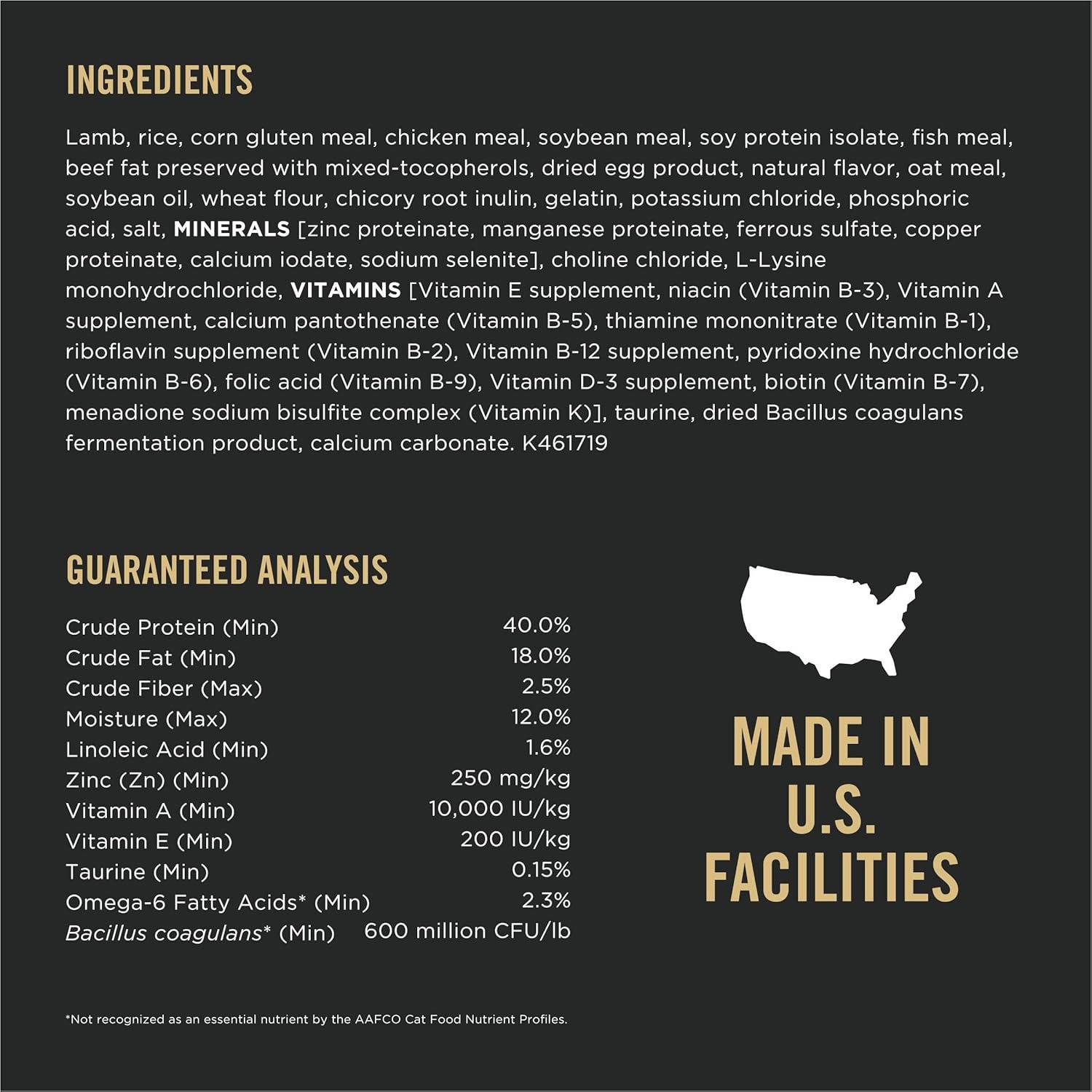 Add a little interest to your cat's mealtime with Purina Pro Plan Brand Cat Food Sensitive Skin and Stomach Lamb and Rice Formula adult dry cat food. This high-protein cat food features real lamb as the first ingredient, and every ingredient is carefully chosen for a specific purpose. We formulate this sensitive stomach cat food with easily digestible rice and oatmeal, which are gentle on her digestive system, and each serving is fortified with guaranteed live probiotics to support her digestive and immune health. Plus, omega-6 fatty acids and vitamin A in this sensitive skin cat food formula nourish her skin and coat. With 100 percent complete and balanced nutrition for adult cats, this super-premium adult cat food lets you feel good about treating your cat to something she loves. Make this Purina Pro Plan sensitive cat food formula a regular part of your cat's diet, and watch her come running each time you call.