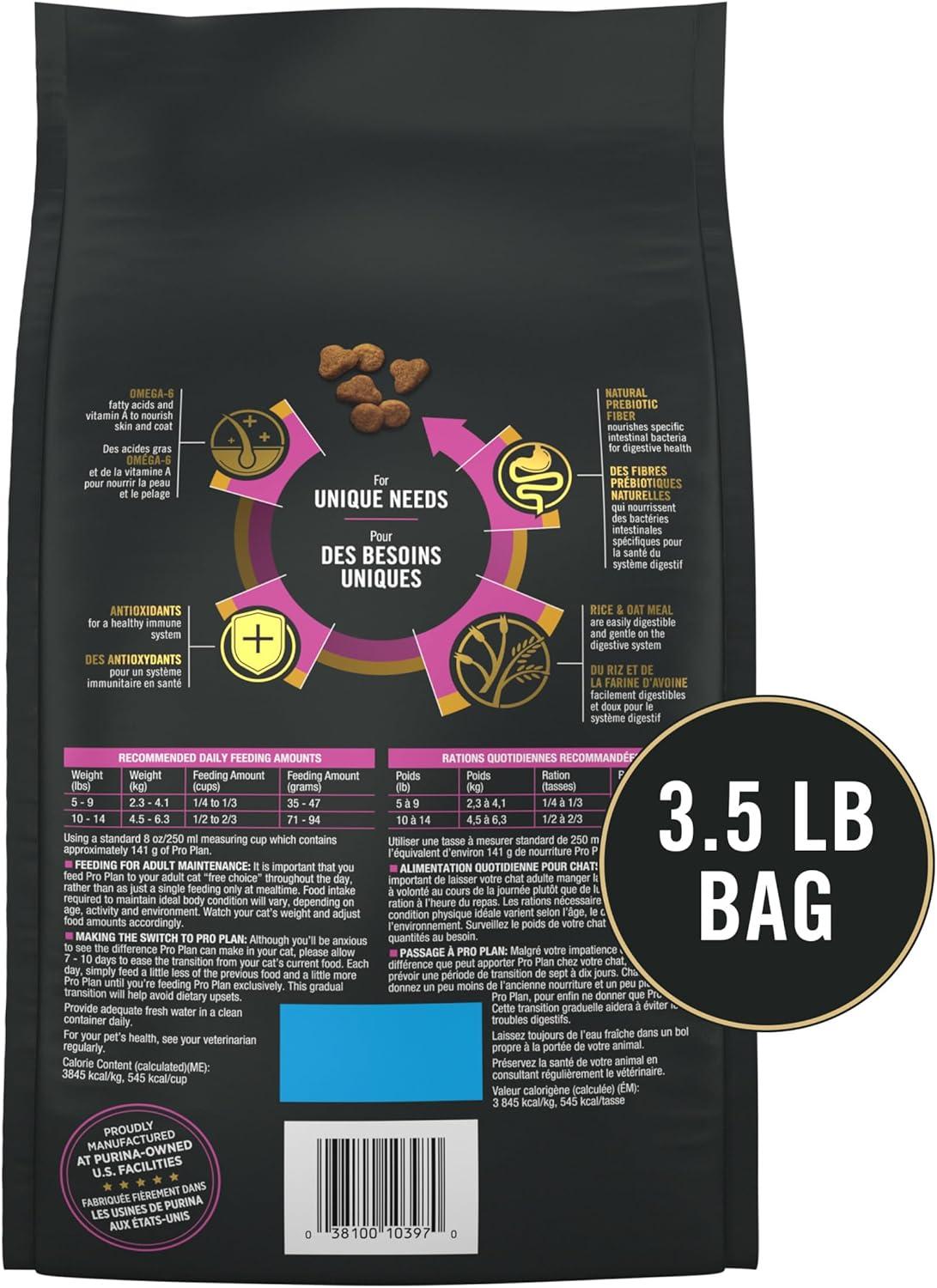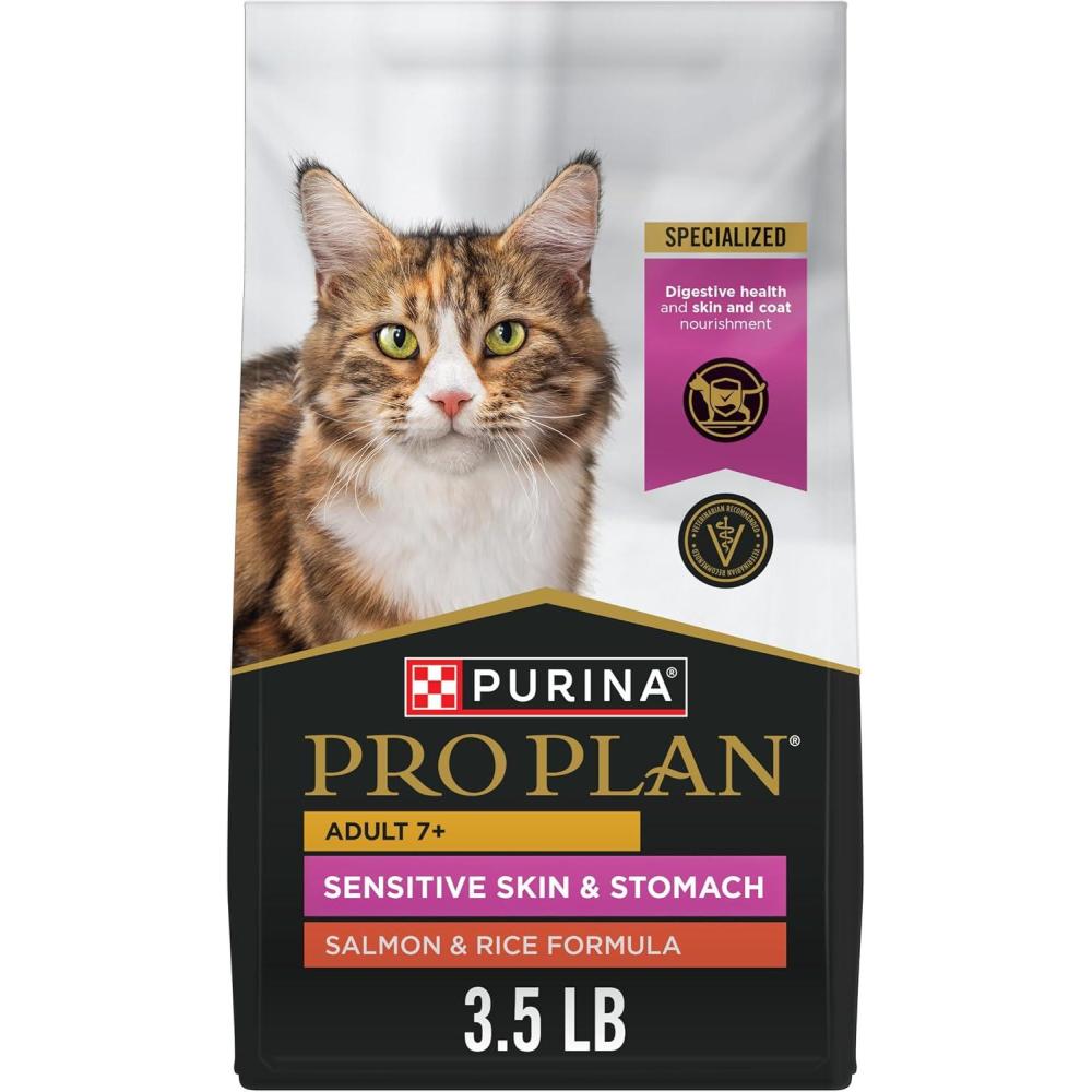 Purina Pro Plan Sensitive Skin and Stomach Adult Cat Food Salmon and Rice is formulated with rice and oatmeal for easy digestion and is gentle on the digestive system.