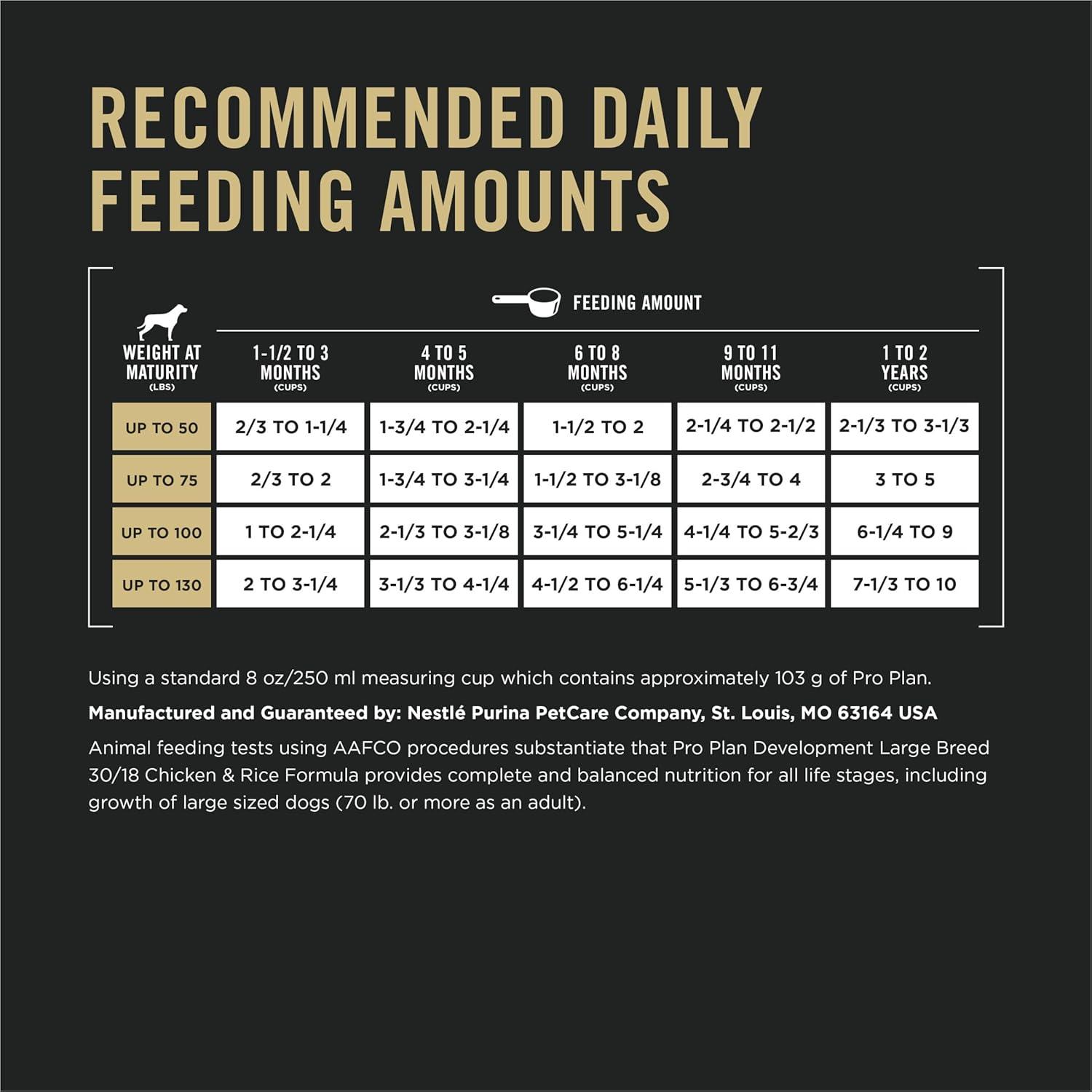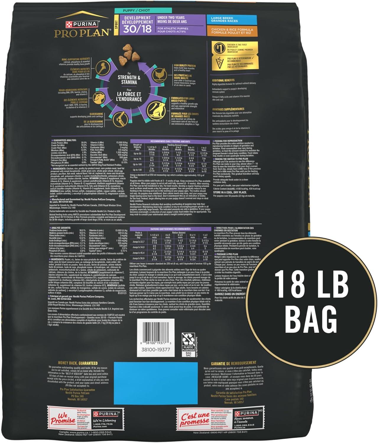 Provide your large breed puppy with fine-tuned nutrition for a healthy growth rate, plus age-appropriate strength and endurance with Pro Plan Sport Large Breed Puppy Development 30/18 Chicken and Rice high protein dog food for puppies. This Purina large breed puppy food is formulated for athletic large breed puppies. It promotes concentration, problem solving and trainability for excellence in the field, the show ring, and at home. Nutrients like calcium, phosphorus and essential vitamins promote healthy bone growth. Plus, this kibble dog food features real chicken as the #1 ingredient and high-quality protein for lean muscle and heart health. It’s also formulated with antioxidants for dogs to support your puppy’s developing immune system. Be confident in the quality and safety of the dog food kibble in every Purina Pro Plan formula, including Purina Sport dog food, because they’re proudly manufactured in Purina-owned U.S. facilities. Try this Purina large puppy food today, risk-free.