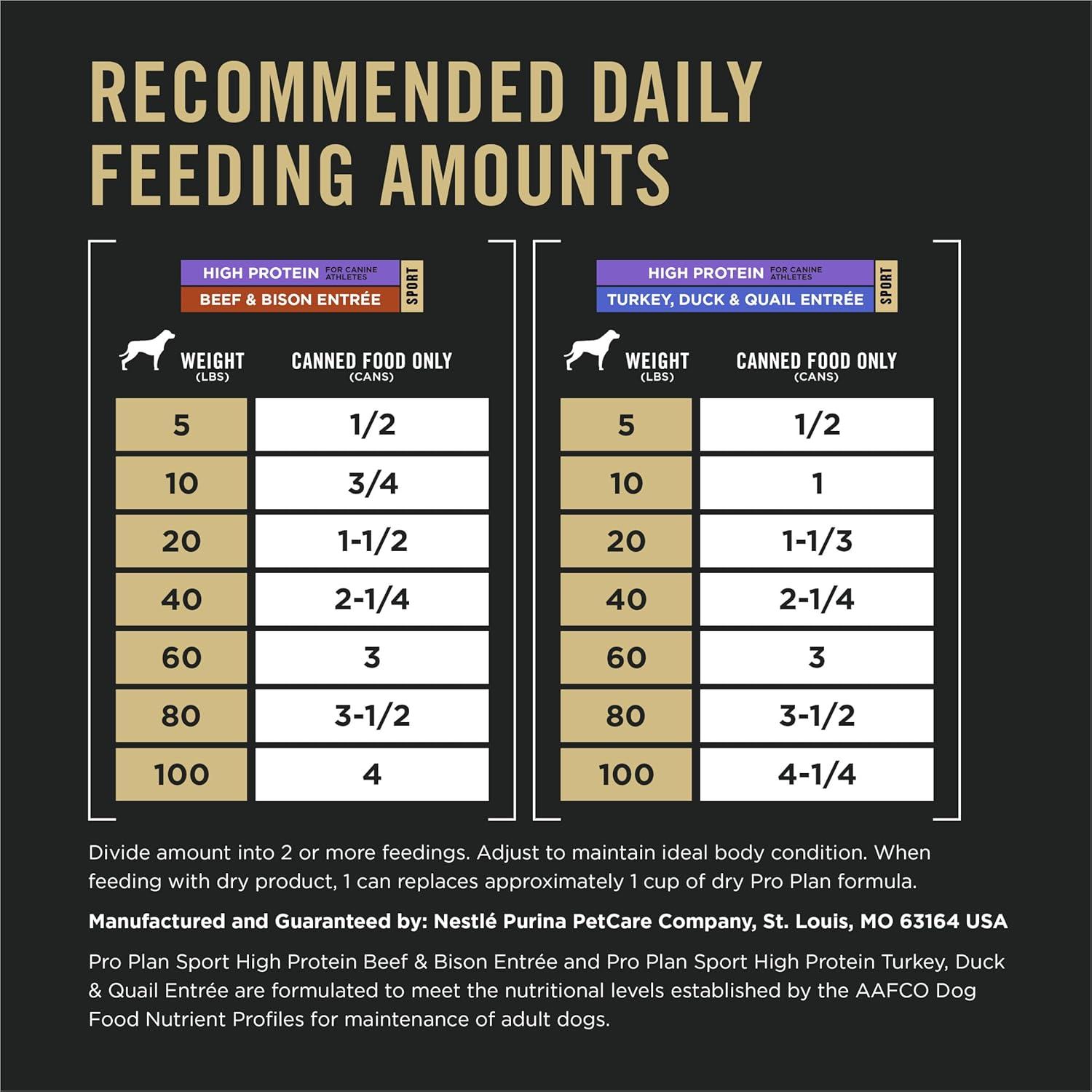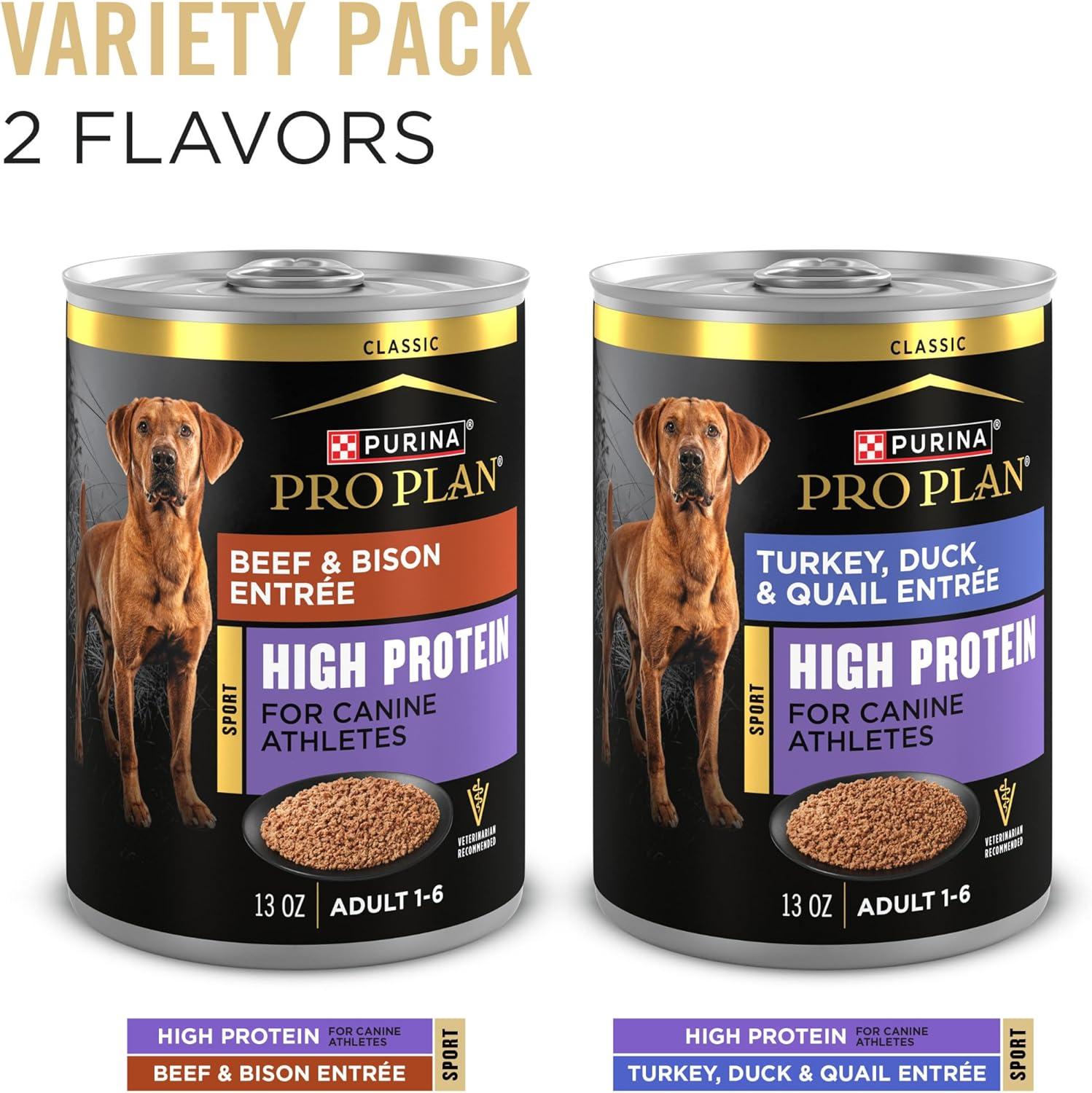 Pro Plan Sport High Protein Wet Dog Food Variety Pack delivers two delicious options. So you can surprise his novelty-seeking tastebuds by rotating two satisfying formulas, including Beef and Bison Entrée and Turkey, Duck and Quail Entrée options. And each formula has real meat or poultry as the first ingredients. So you can surprise him every day by serving it in between meals, on its own, or as a dry dog food topping. When he hears you open the convenient pull-top can, he’ll eagerly anticipate his next great performance-supporting meal. And these formulas are 100 percent complete and balanced for adult dogs. So every serving of these premium canned dog food formulas has 23 essential vitamins and moisture to support healthy hydration. Every bowl has antioxidants for a healthy immune system. Plus, Pro Plan Sport is the official performance dog food of Ducks Unlimited. So when you offer this to your dog, you’re giving him innovative nutrition that performs.