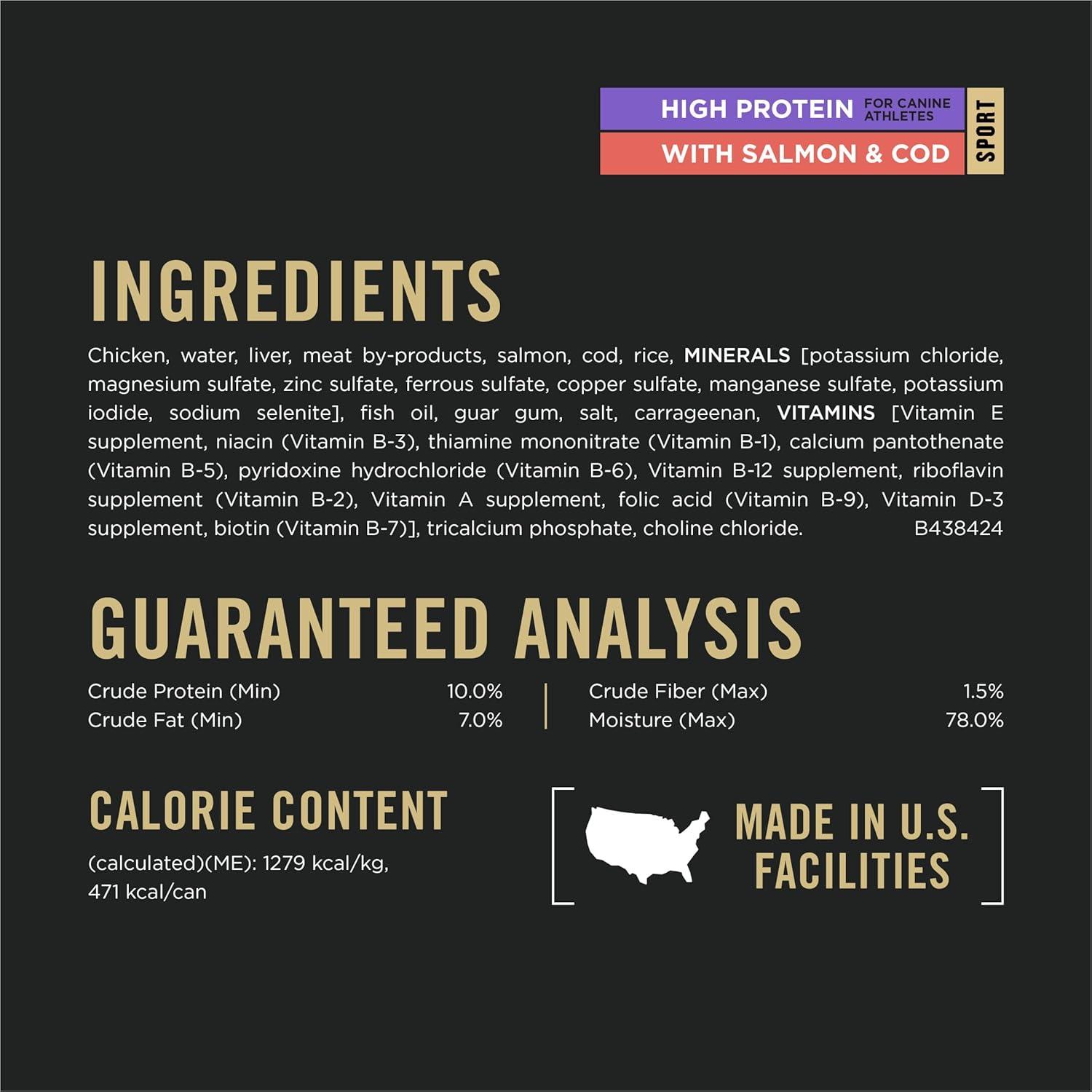 Purina Pro Plan Sport High Protein With Salmon and Cod Entrée Wet Dog Food helps your dog thrive and explore his full athletic potential. Featuring real salmon and cod, this protein-rich seafood power meal is made to suit the nutritional needs of your active dog. Suitable as both a complete meal or an enhancement, it can be served on its own or as a dry dog food topping. Each serving of this novel protein dog food formula is 100 percent complete and balanced for your canine athlete and features 23 essential vitamins and nutrients. Plus, it has moisture to support healthy hydration to help your dog achieve his full athletic potential. Made with antioxidants, this concentrated formula also helps support a healthy immune system. Plus, Pro Plan Sport is the official performance dog food of Ducks Unlimited. So every time you feed this to your dog, you’re offering him concentrated nutrition that fuels him.