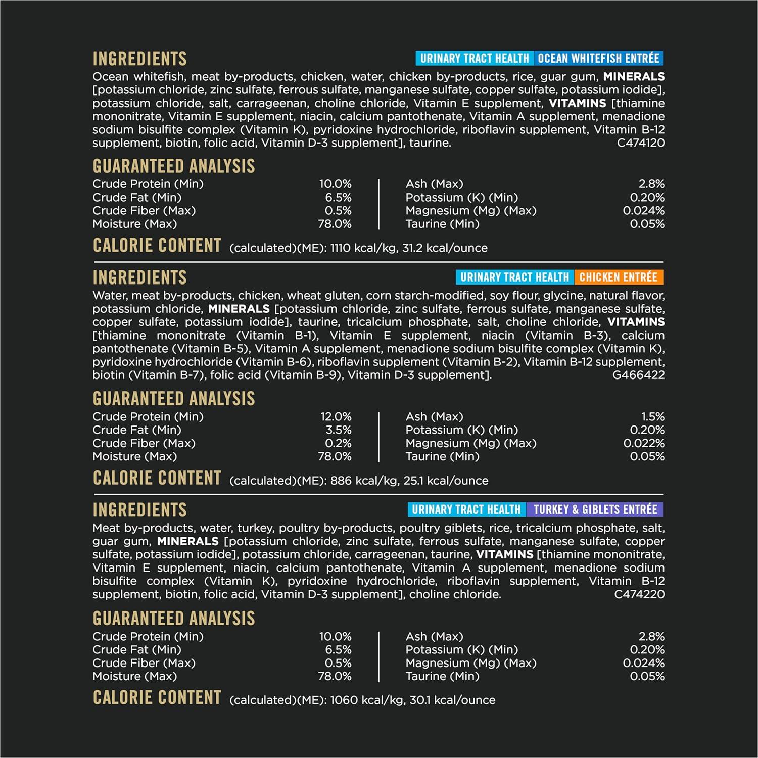 Be sure your cat gets the extra care she needs when you bring home the variety of pleasing mealtime options in this Purina Pro Plan SPECIALIZED Urinary Tract Health Formula adult wet cat food variety pack. Three distinct high protein wet cat food entrees give you a way to make mealtime interesting, and each formula is made with real fish or poultry plus other high-quality ingredients for a taste cats love. Every pate cat food and gravy cat food variety in this collection is formulated to help maintain your cat's urinary tract health by reducing urinary pH and providing low dietary magnesium. Our highly digestible adult cat food formulas promote optimal nutrient delivery. With 25 essential vitamins and minerals plus taurine, an amino acid, these high protein urinary cat food entrees help support your feline friend's overall health and wellness. She gets focused nutrition to support her unique needs and great taste in every can when you feed her high-quality meals from a trusted brand.