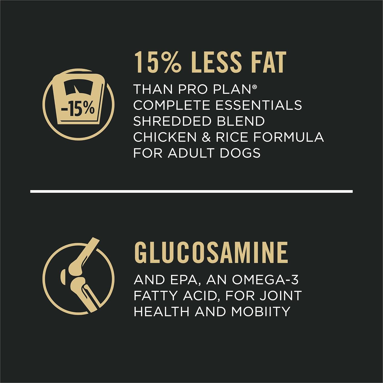 Make mealtime a tasty and healthy experience with Purina Pro Plan Brand Dog Food Shredded Blend Weight Management Chicken and Rice Formula adult dry dog food. This high-quality formula with real chicken as the first ingredient helps deliver the nutrition he needs and the flavor he loves, while the combination of hard dog food kibble and tender shredded pieces provides an enticing texture. With 15 percent less fat than our Pro Plan ESSENTIALS Shredded Blend Chicken and Rice Formula for Adult Dogs, this weight management dog food gives your dog a meal you can feel good serving. The natural prebiotic fiber in our dog dry food nourishes the beneficial bacteria in your dog's intestinal tract, working to maintain a good balance, and guaranteed live probiotics help support his digestive health. With 100 percent complete and balanced nutrition and high-quality ingredients, this Purina Pro Plan SPECIALIZED weight control dog food gives your adult dog a mouthwatering meal while supporting his health and wellness.
